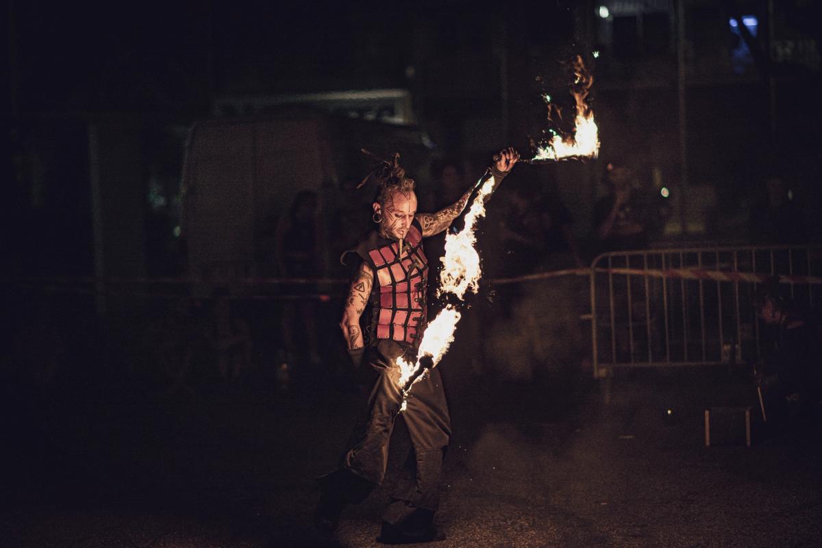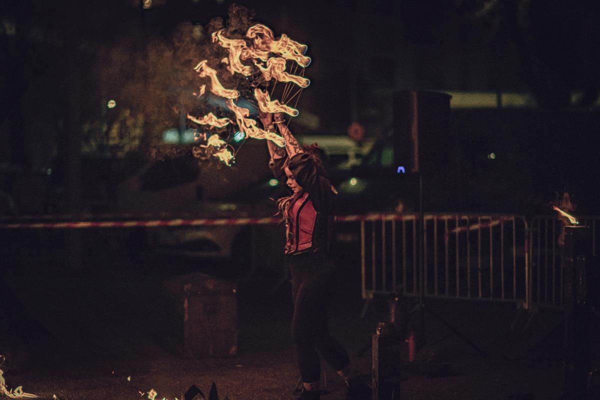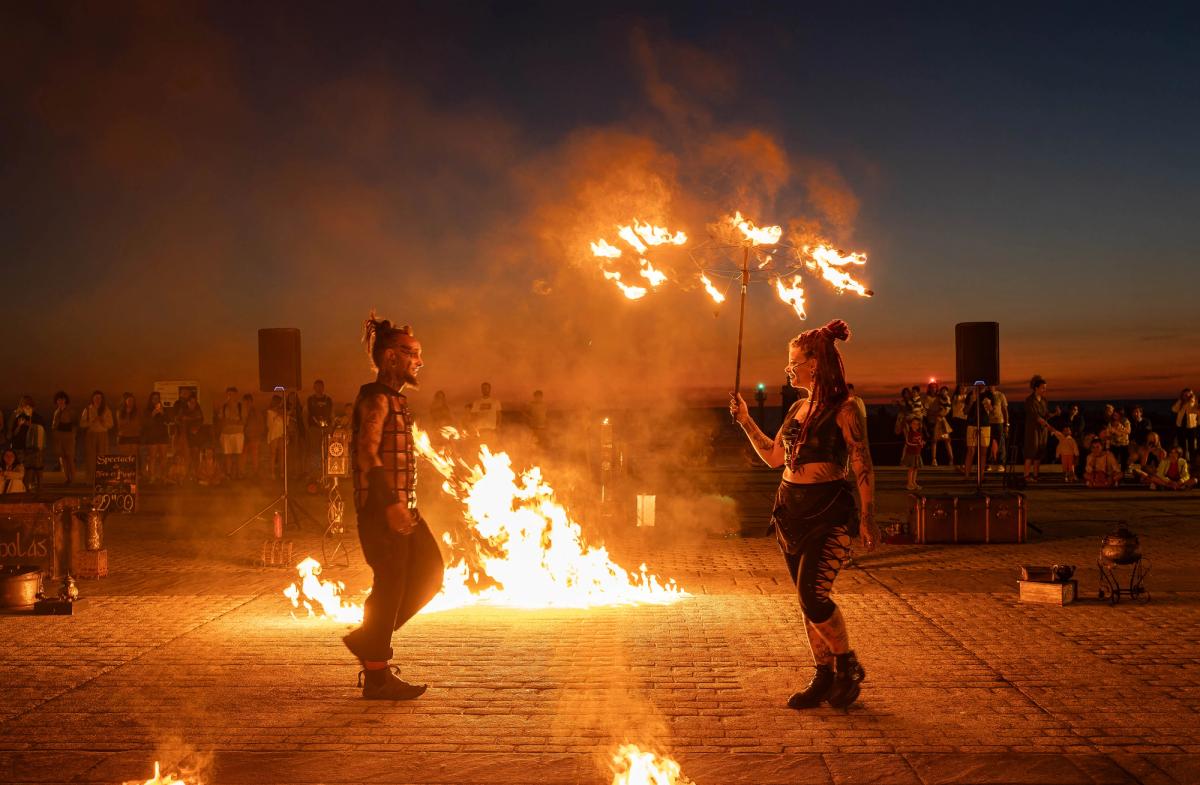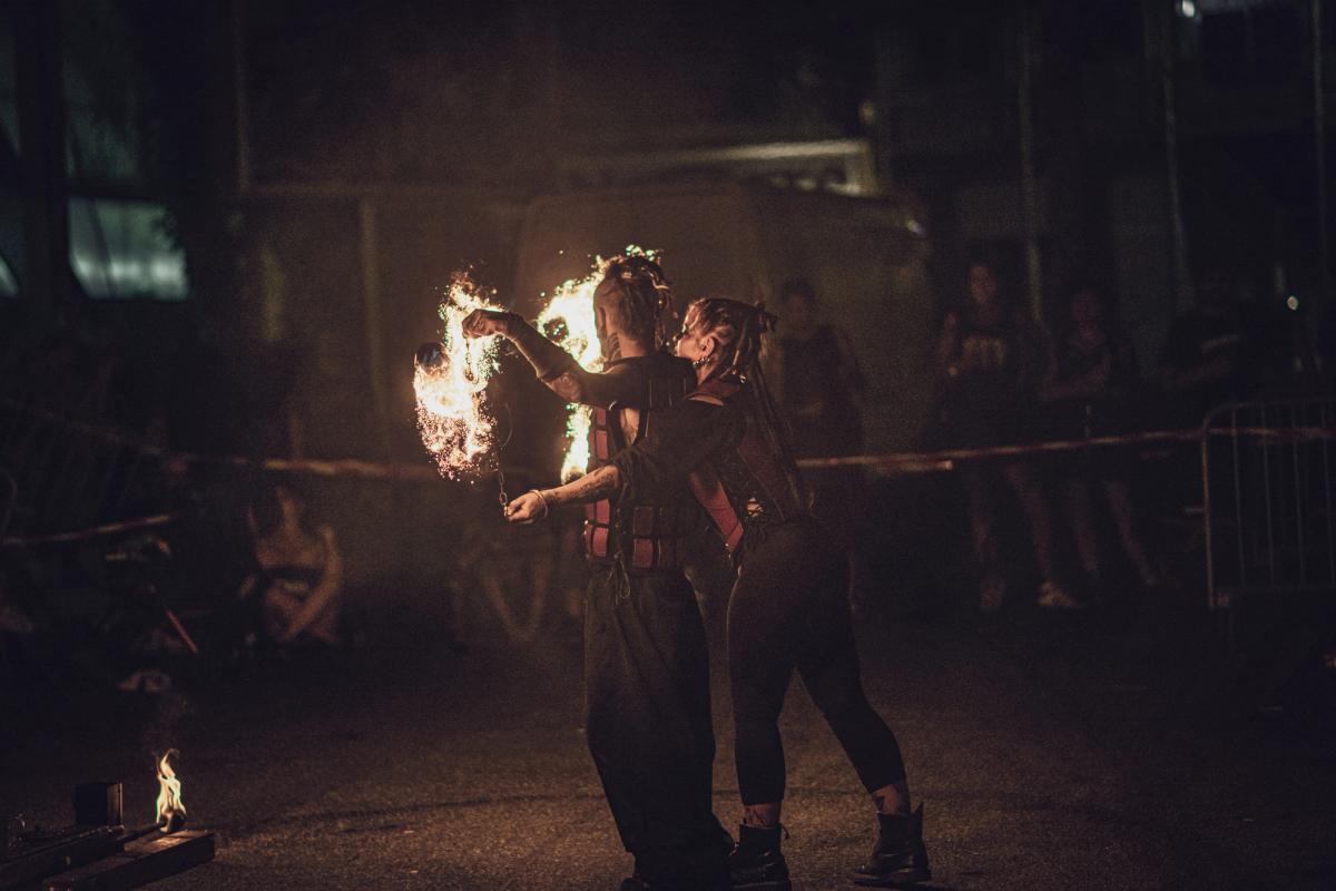 Arnaud Vidal et Jessica Disceux démontre dans ce duo une maîtrise pointue de nombreuses disciplines feu (bolas, swing, double staff, staff contact, éventails, rope dart, parapluie), couplée à des techniques d’illusionnistes et d’artificiers.